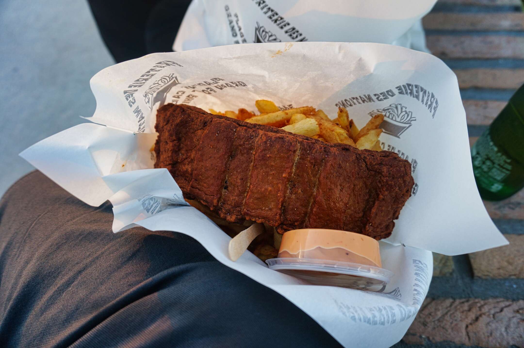 Il fait bon, nous sommes en tee-shirt On trouve une vraie friterie avec des noms d’aliments inconnus : exemple maxicanto, fricandelle, grizli etc.. Il nous aurait fallu un traducteur Même en voyant les produits on ne sait pas ce que c’est ni ce qu’il y a dedans il y a quatre prix pour les frites sans indication.