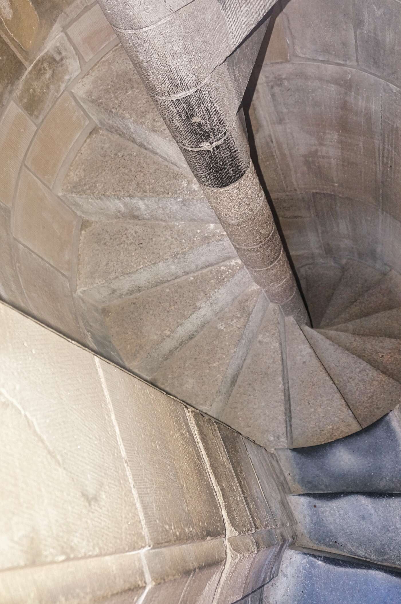 Il y a plusieurs paliers, heureusement pour notre palpitant. L’escalier est très étroit, raide et on peut à peine poser les deux pieds à plat sur les marches.