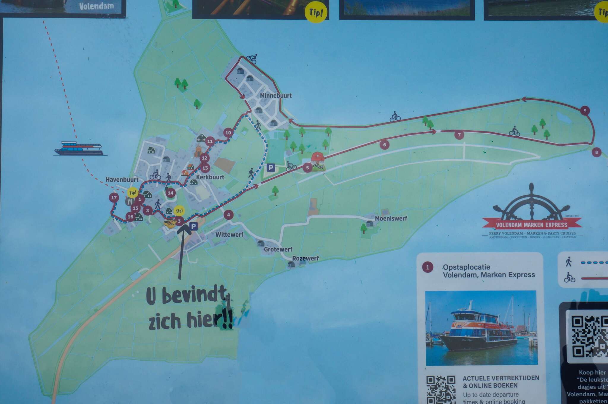 Il est 15h. Le bateau arrive. Oups on coure aux vélos et on arrive à temps pour le prendre Il nous amène directement à Volendam en trente minutes avec une belle vue sur la péninsule que nous quittons et une belle arrivée à Volendam.