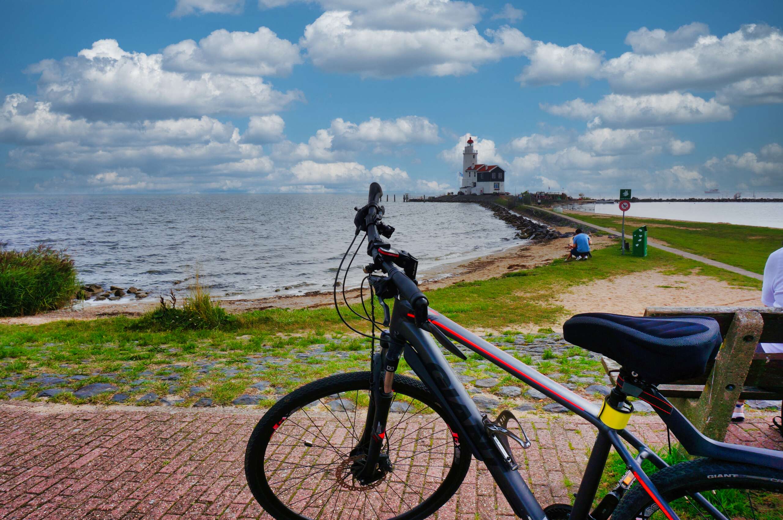 De la pluie toute la nuit. Matin gris. On part en vélo depuis le Marina Park de Volendam jusqu’à Marken. C’était censé faire 14, en fait près de 25 kms de piste cyclable plate. Ça se fait bien. On fait le tour de l’île en passant par le phare jusqu’au port. Le soleil est là, il fait beau et chaud Un peu trop pour ma chérie partie sans lunettes de soleil ni crème solaire, veste polaire sur le dos.