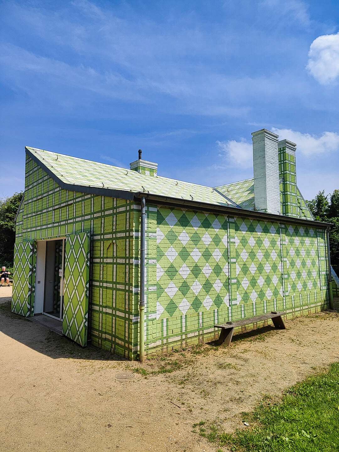 Cette maison, située à Atlantikwall Raversyde, se distingue par son apparence unique. Elle est recouverte d’un motif géométrique vert et blanc qui imite un tissu écossais, ce qui lui donne un aspect presque surréaliste. Le motif couvre l’ensemble de la structure, y compris le toit, les murs et même les cheminées, créant une illusion visuelle saisissante.
