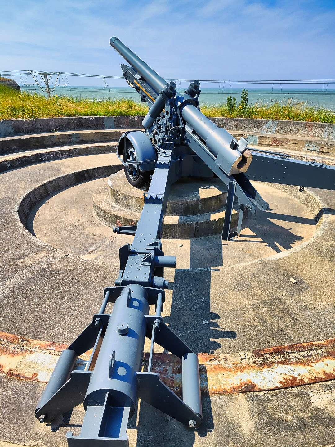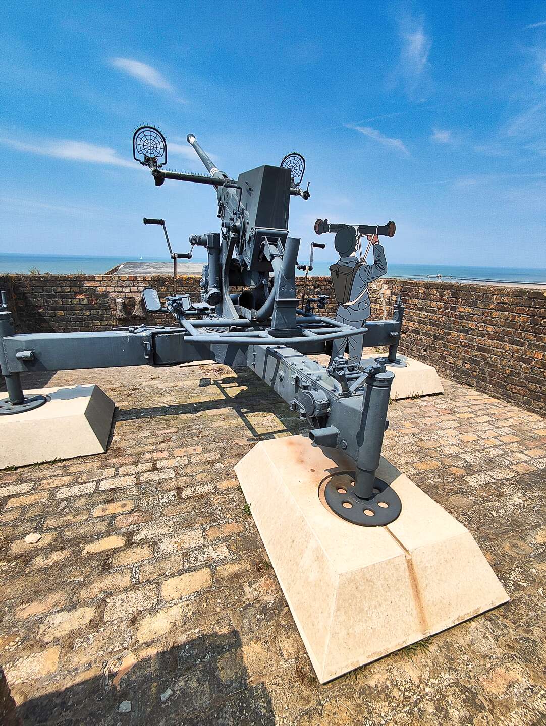Ce type de canon était largement déployé sur le Mur de l’Atlantique pour protéger les positions allemandes contre les attaques aériennes alliées. Son affût permettait une rotation rapide et une bonne élévation pour engager des cibles en mouvement.