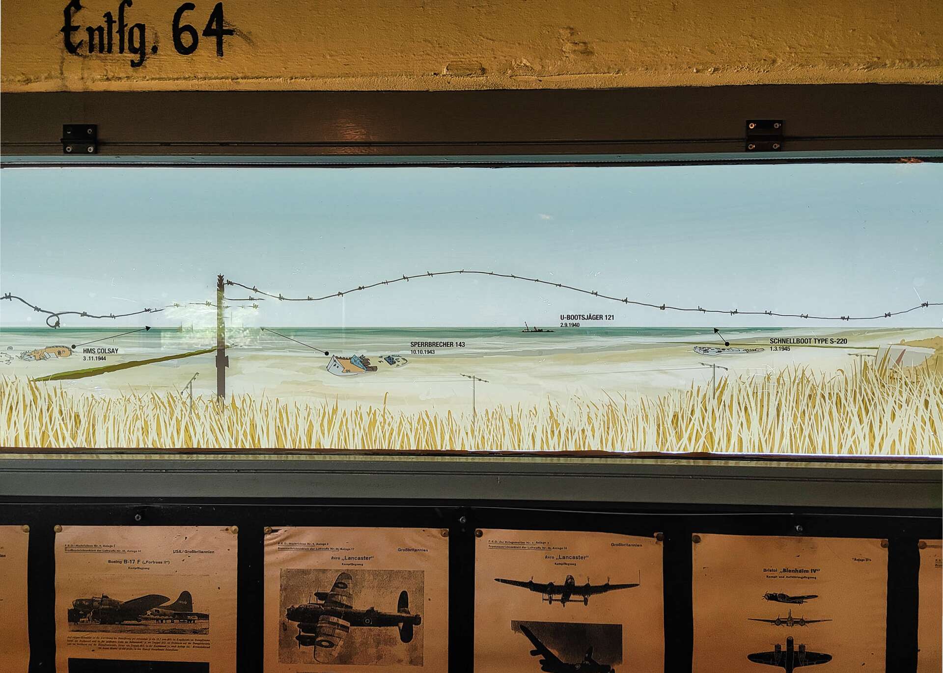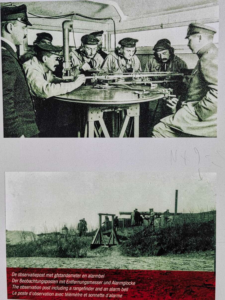 Grâce à une large meurtrière, les observateurs pouvaient scruter l’horizon, de Nieuwpoort à l’entrée du port d’Ostende. Des silhouettes de navires et d’avions permettaient une identification rapide des unités ennemies ou alliées.