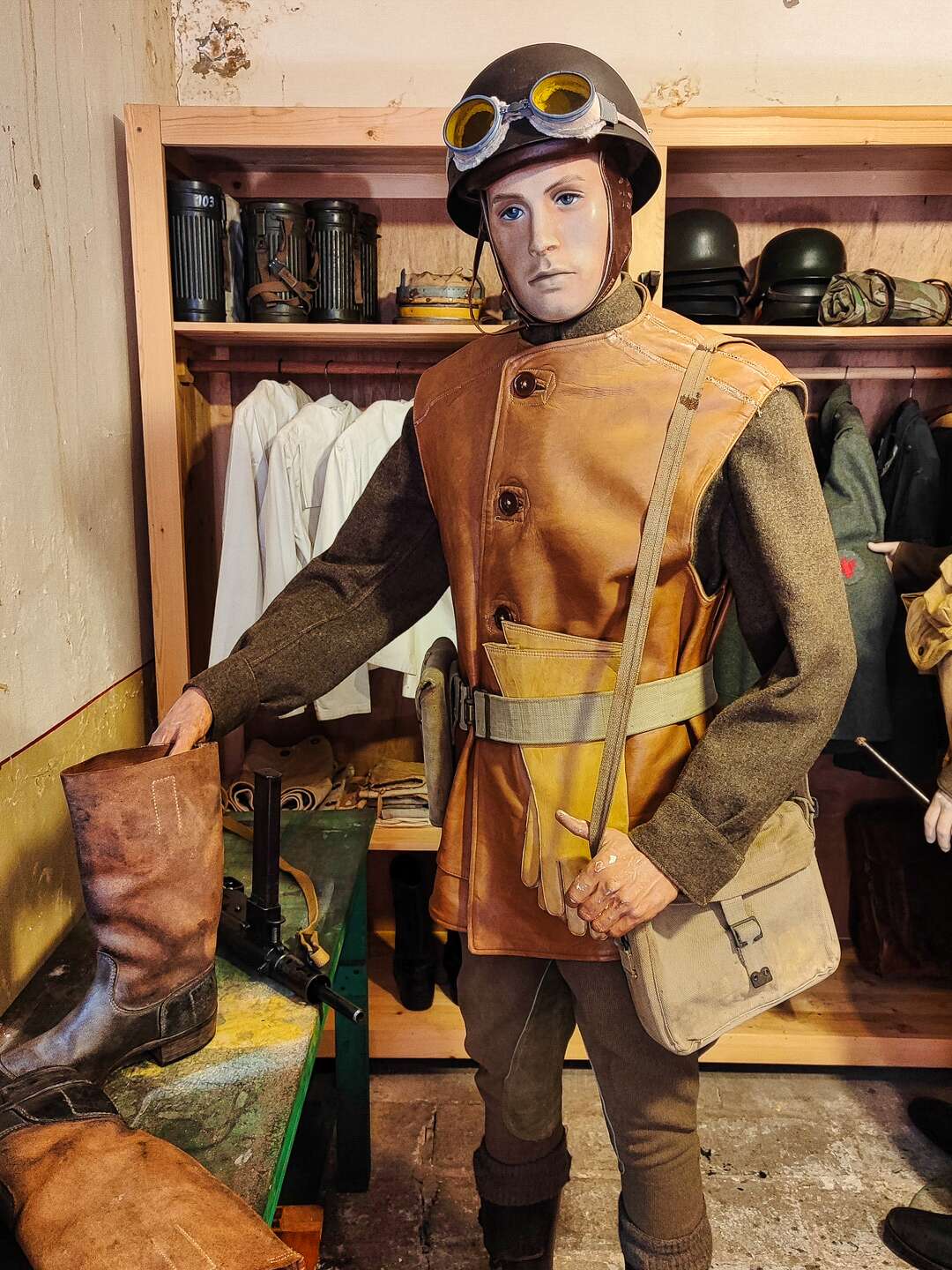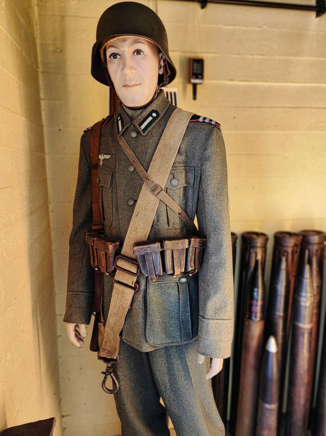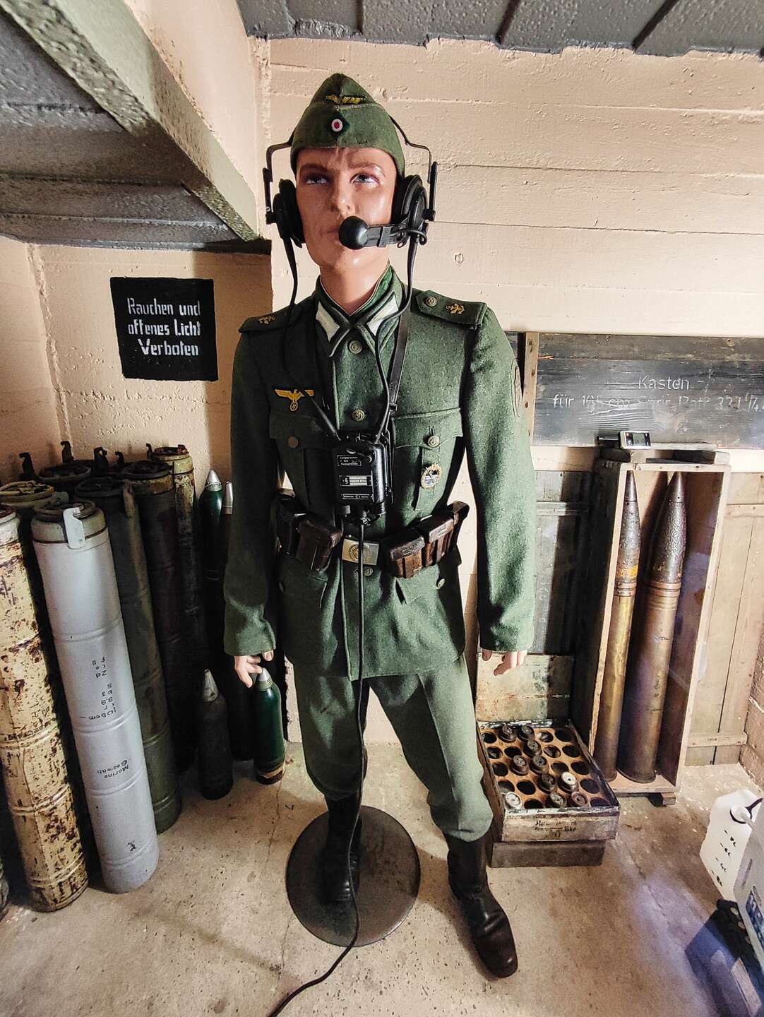 🔹 Le mannequin représente un opérateur radio de la Wehrmacht, vêtu d’un uniforme vert typique de l’armée allemande pendant la Seconde Guerre mondiale. Il porte un casque avec micro et une radio en bandoulière, soulignant son rôle dans les communications militaires.