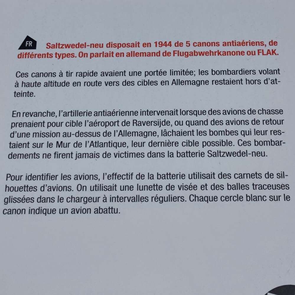 En 1944, la batterie Saltzwedel-Neu était équipée de cinq canons antiaériens de différents calibres. Ces armes, appelées Flugabwehrkanone ou plus simplement FLAK en allemand, avaient pour mission de protéger la zone contre les attaques aériennes alliées.