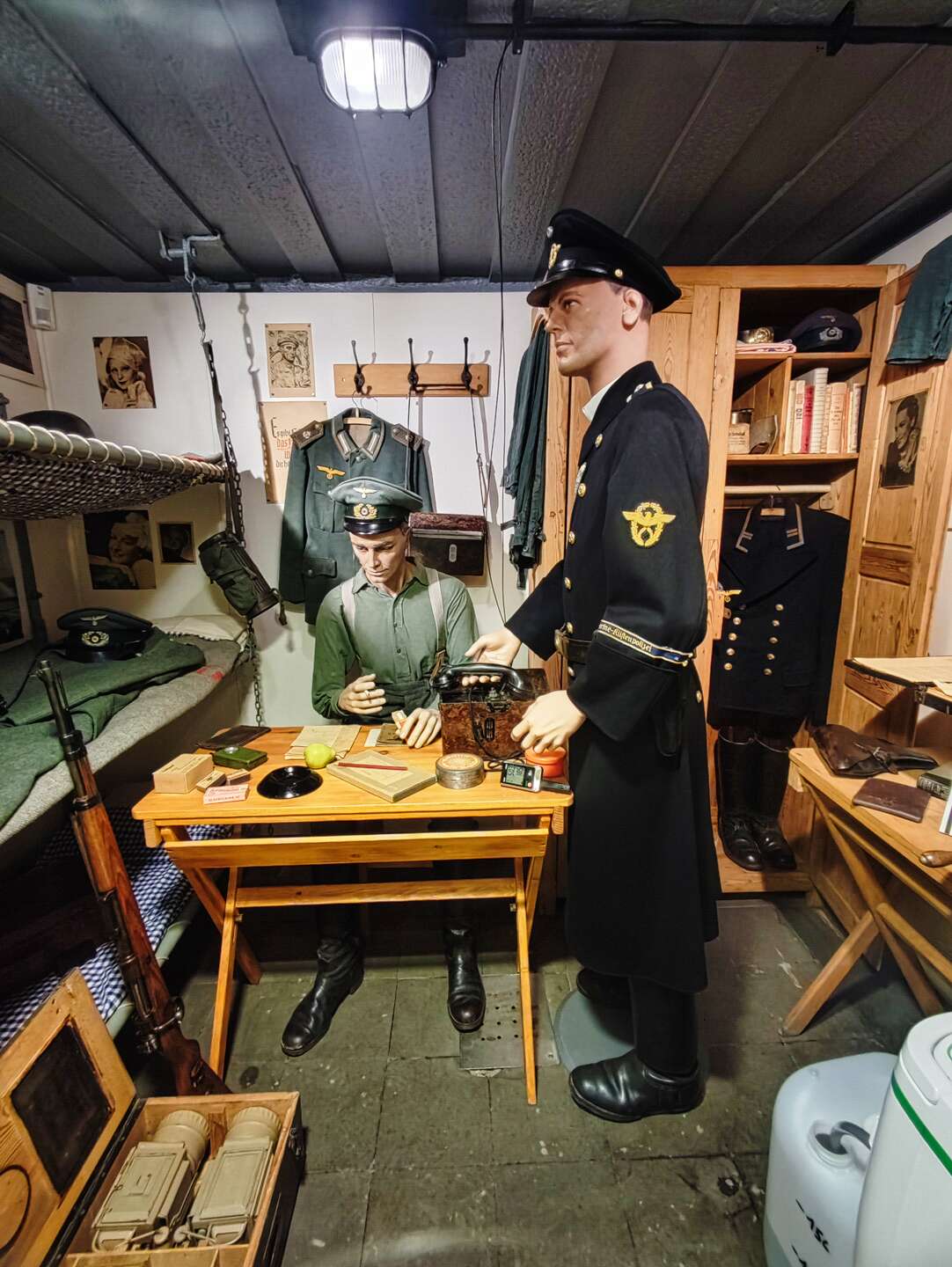 - L’autre mannequin, en uniforme noir avec un insigne de la Kriegsmarine sur la manche, pourrait être un officier de la marine allemande donnant des instructions.