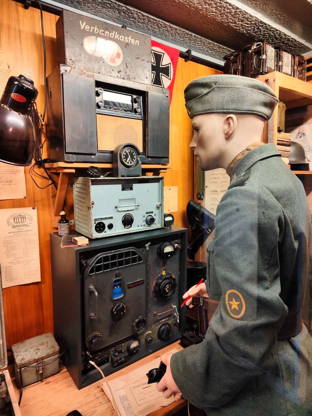 Un mannequin en uniforme militaire allemand est placé devant un imposant émetteur-récepteur radio. Il semble en pleine transmission, tenant un combiné dans une main et un stylo dans l’autre, prêt à noter des informations stratégiques. Son uniforme arbore un insigne en forme d’étoile sur la manche, indiquant peut-être une spécialisation technique.