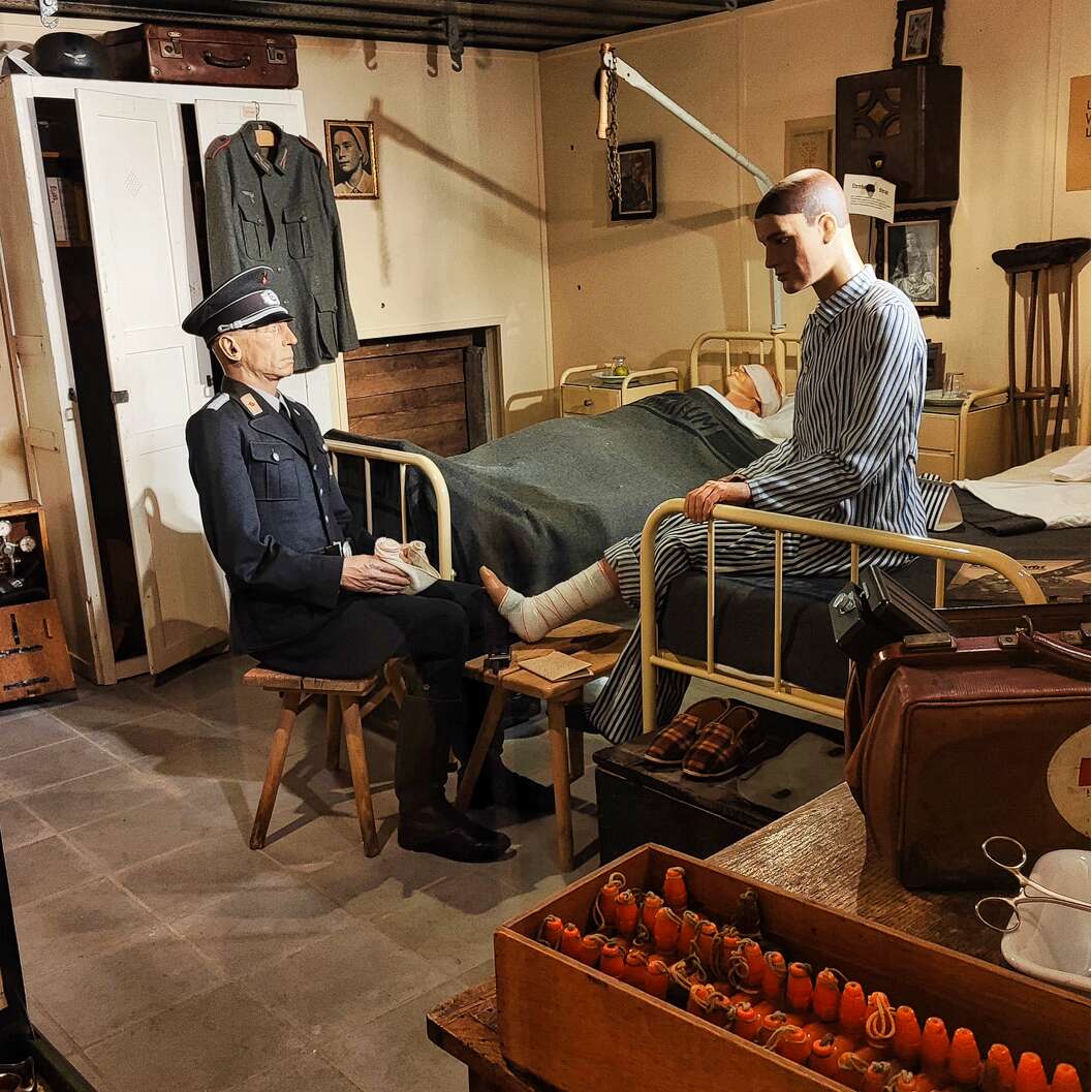 Cette photo, prise à Atlantikwall Raversyde, représente une scène reconstituée d’une infirmerie militaire allemande pendant la Seconde Guerre mondiale.